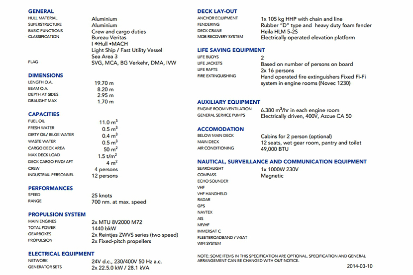 | 發電機組: | 2×MTU 8V2000M72 | 船組人員: | 4 P |