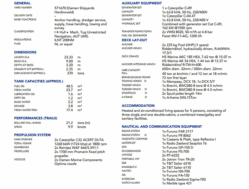 | 發(fā)動機功率: | 1268bkW at 1800rpm | 推進裝置: | 2×1700mm Promarin fixed pitch propellers |