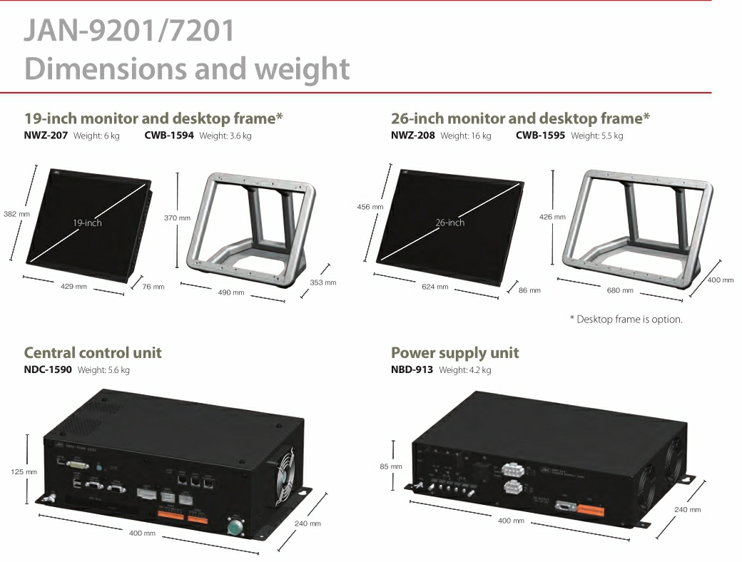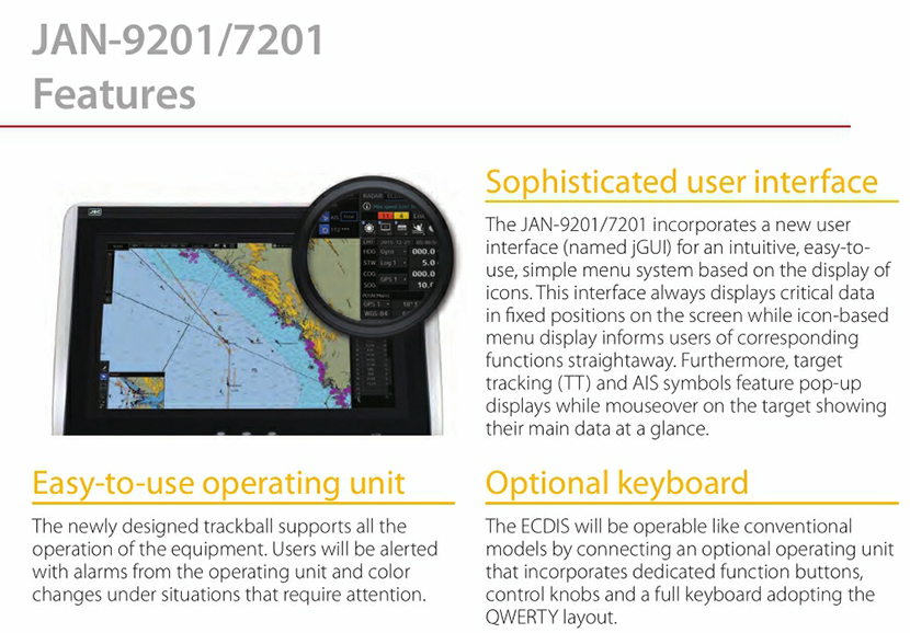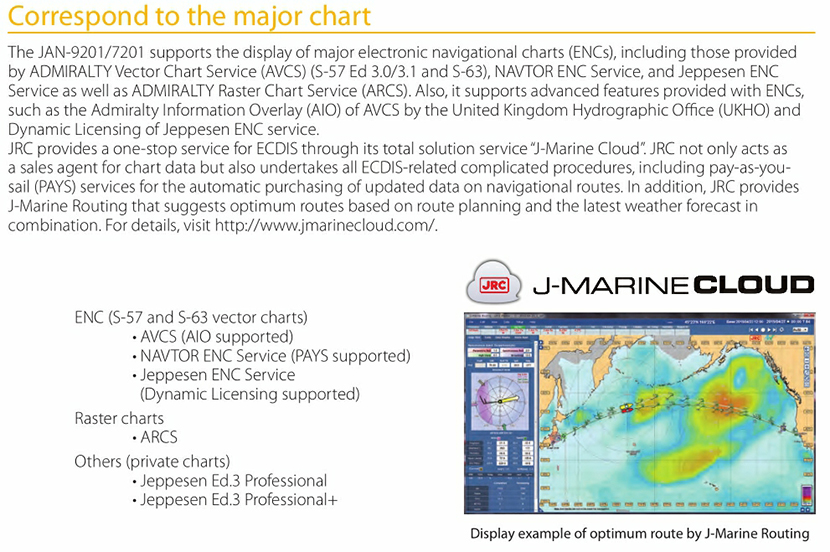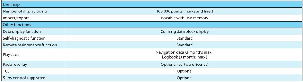 | 顯示單元: | 26英寸 | 電子海圖庫: | ENC S-57 Ed3.0/3.1 and S-63 AVCS (AIO supported), NAVTOR ENC Service, and Jeppesen ENC Service Raster charts- ARCS Personal chart-Jeppesen Ed.3 Professional/Professional+ |