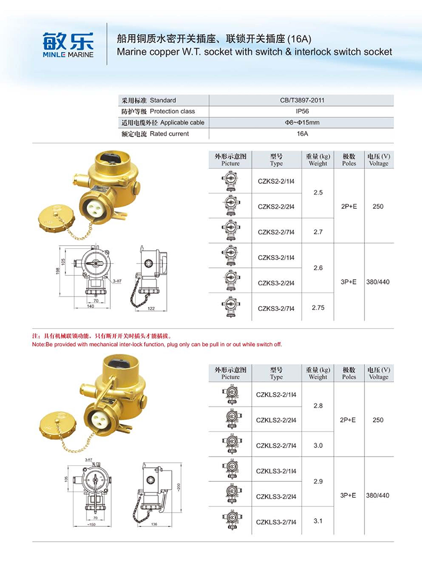 船用銅質(zhì)水密聯(lián)鎖開關(guān)插座(16A)