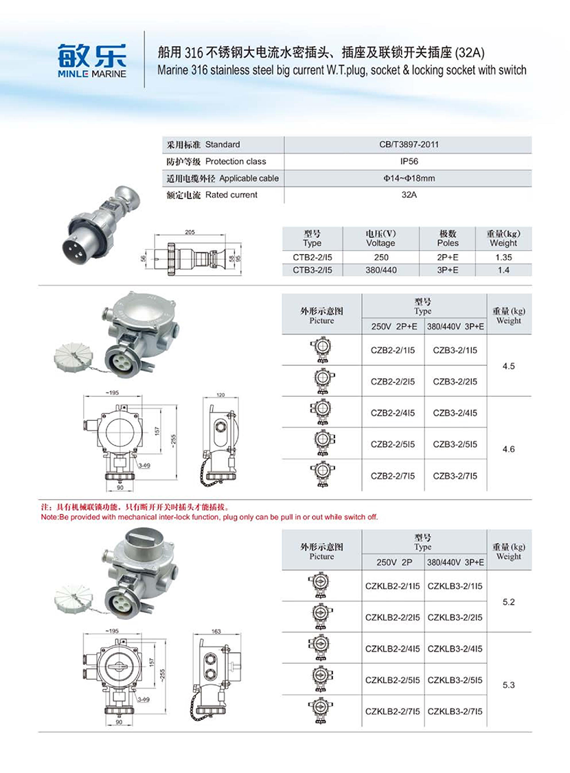 | 船用316不銹鋼大電流水密聯(lián)鎖開關(guān)插座(32A) | |||