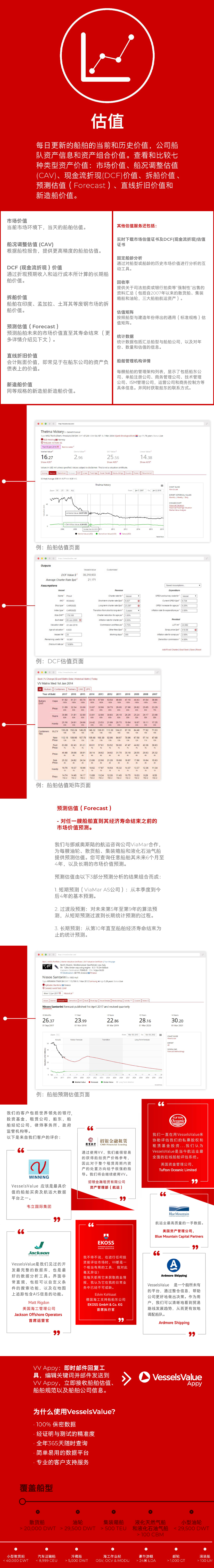 | 包含內容: | 市場價值(證書下載);DCF價值(證書下載);船舶調整估值CAV;拆船價值;預測估值;直線折舊價值;新造船價值;固定船齡分析;回收率;估值矩陣;歷史估值統計數據;船舶及管理機構詳情 | 內容及功能亮點: | 不受市場流動性限制給出精準估值;數據可同屏對比; |