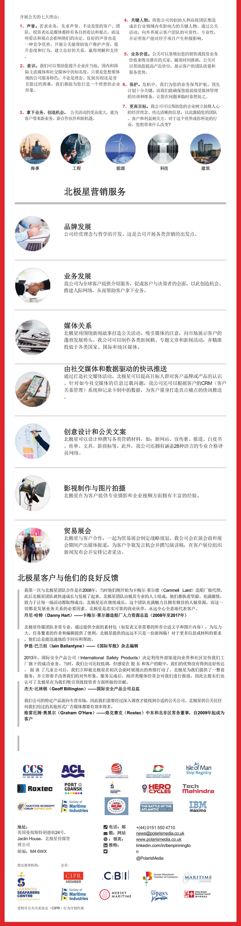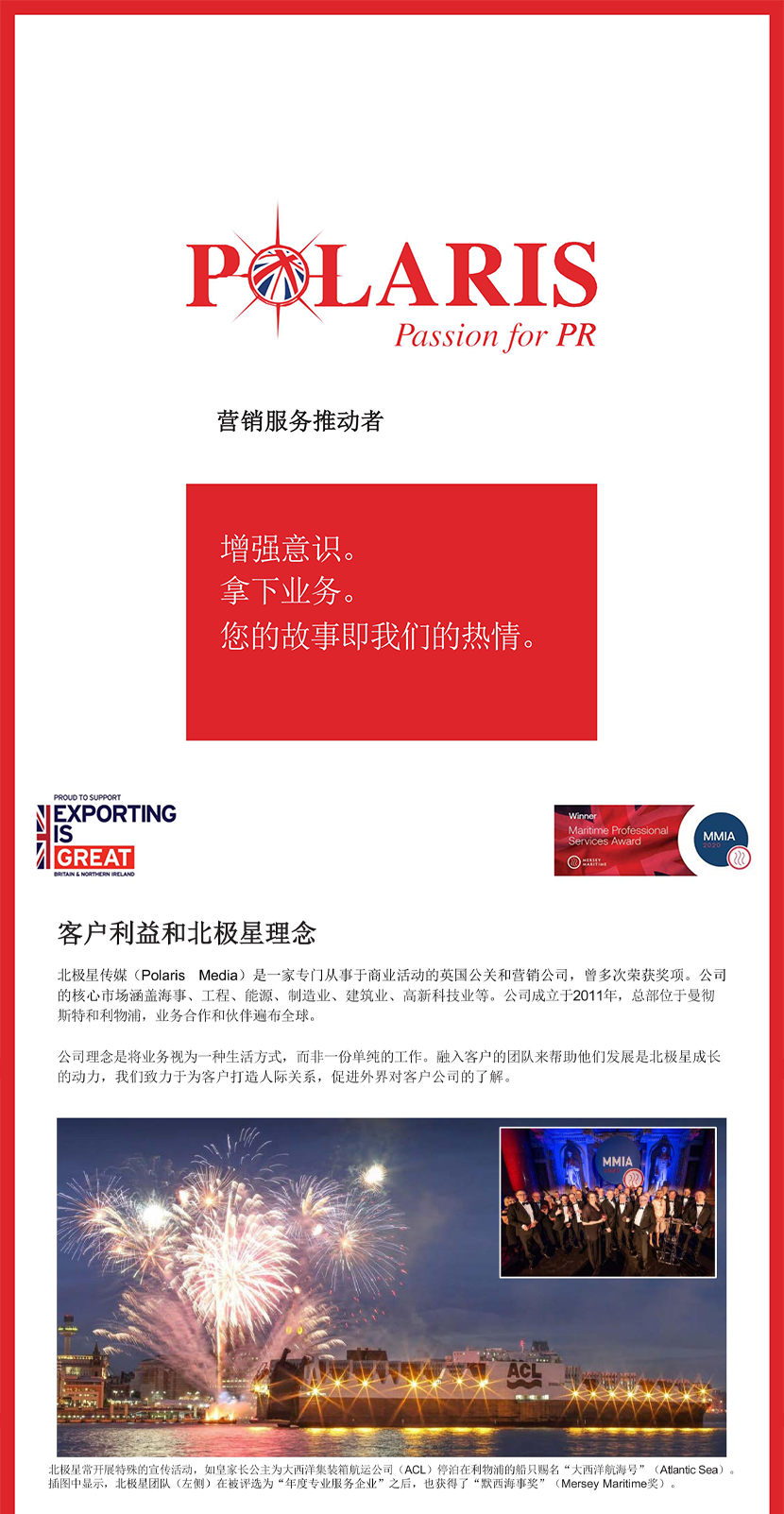 | 專業優勢: | 對航運業公關課題研究多年;從事商業公關及營銷活動經驗豐富;完善的公關體系;業務鏈條完整;豐富的人脈資源;公關效率可觀;榮獲“年度專業服務企業”及“默西海事獎” | 合作伙伴: | CCS; ACL; Roxtec; Port Gdansk; Oman; Isle of Man Ship Registry; Seafarers Center; Maritime Economy Forum Gdynia; Maritime Foundation; Society of Maritime Industries |