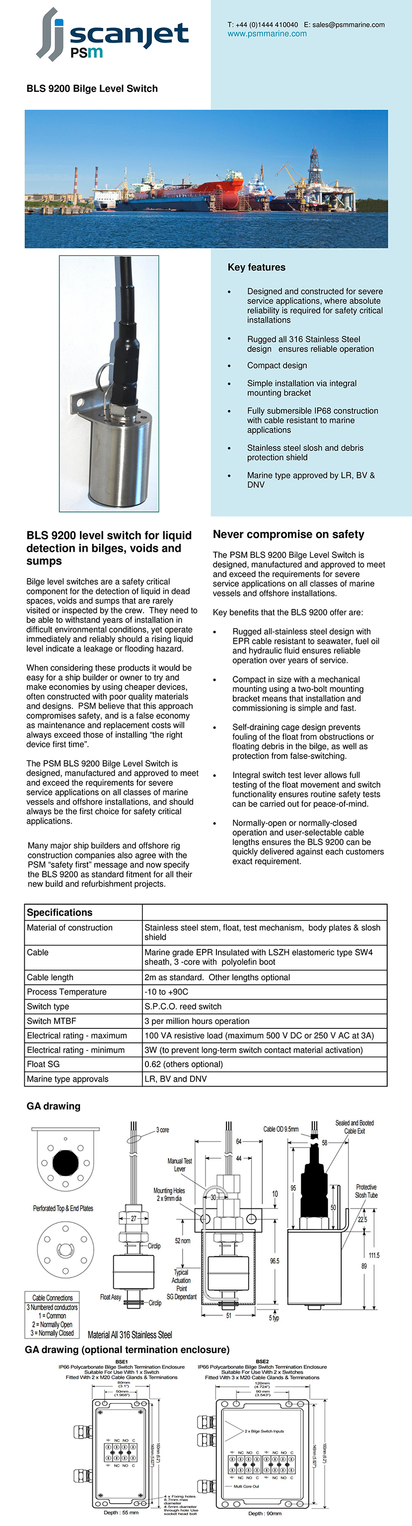 性能亮點: Reliable operation over years of service in difficult environmental conditions; Compact design; Installation and commissioning is simple and fast; Self-draining cage design prevents fouling of the float from obstructions or floating debris in the bilge, as well as protection from false-switching 防護等級: IP58