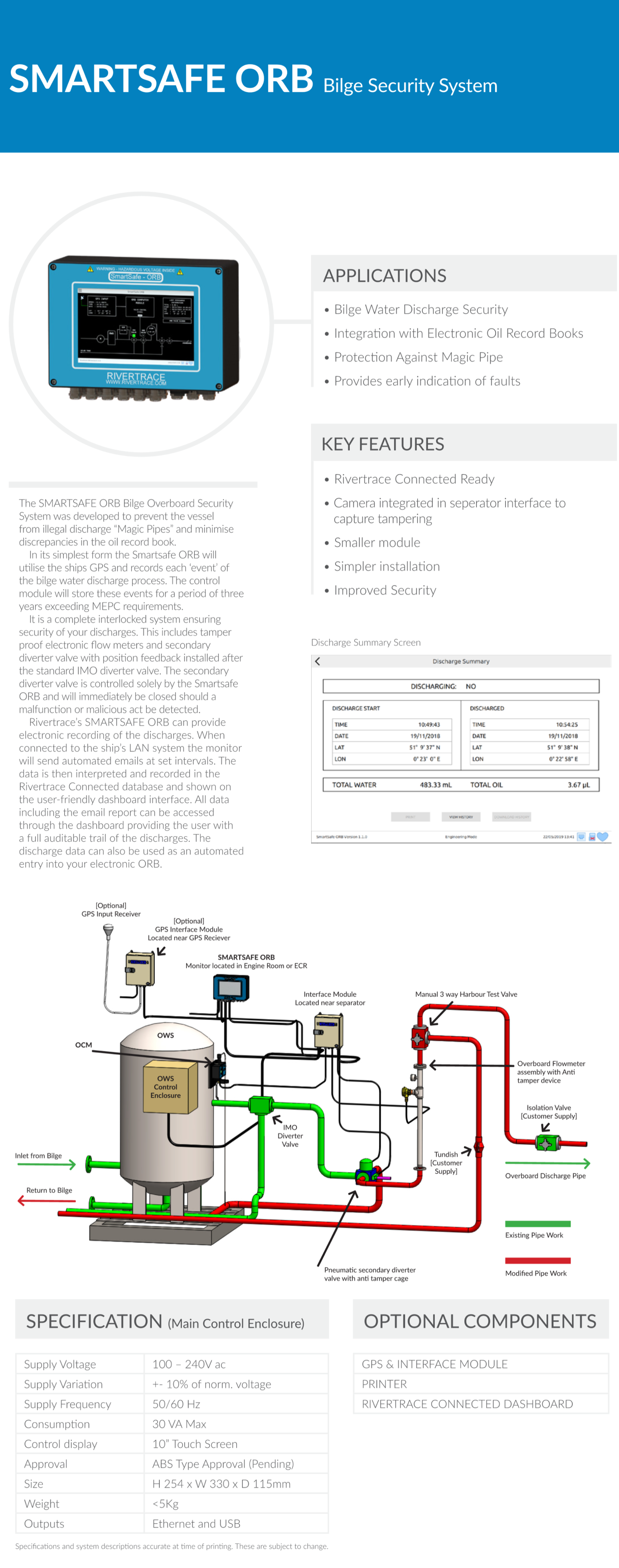 數據存儲終端: Rivertrace數據庫 應用領域: Bilge water discharge security; Protection against magic pipe; Provides early indication of faults
