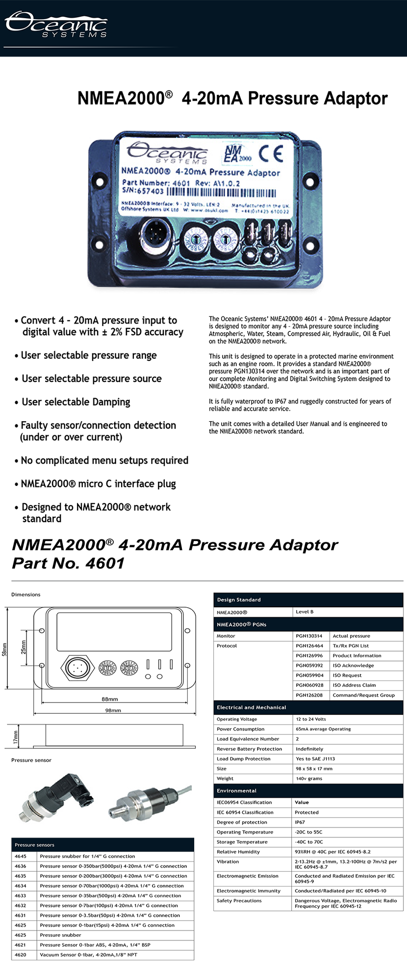 液位傳感輸出信號至PGN轉譯器4291Oceanic Systems (UK) Ltd. |