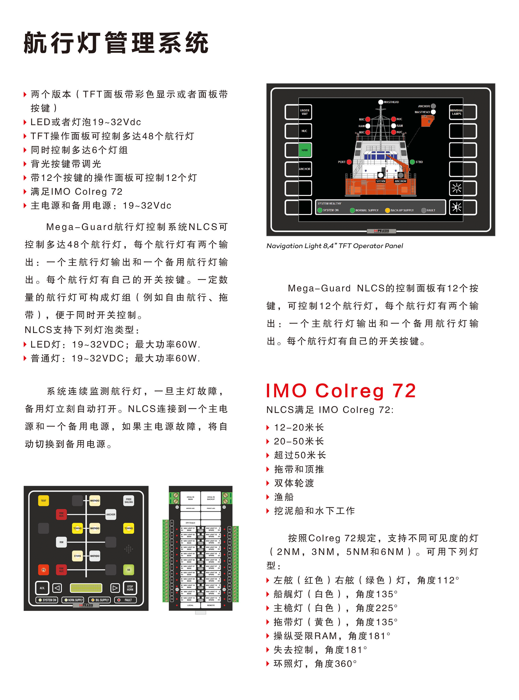類型: 航行燈控制 系統(tǒng)特點(diǎn): 可控制多達(dá)48個航行燈,每個航行燈有兩個輸出,一個主航行燈輸出和一個備用航行燈輸出